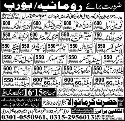A well reputed and established company is looking for Foremen Civil, Foreman Mechanical, Foreman Electrical, Foreman Scaffolding, Foreman Folding, Mason, Shuttering carpenter, Furniture Carpenter, Steel Fixer, Electrician, Plumber, Pipe Fitter, Painter, Rigger, Sand Blaster, Jipsam Worker, Shawal Operator, Bulldozer Operator, Back Hoe Operator, Fork Lift Operator, Mobile Crane Operator, Welder in Romania Europe.