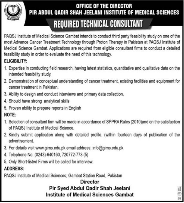 Vacant posts including technical consultant are announced in Pir Abdul Qadir Shah Jeelani Institute of Medical Sciences Khairpur, khairpur Sindh Pakistan as per 9 July 2022 advertisement in daily Kawish Newspaper. Bachelor etc. educational qualification will be preferred.