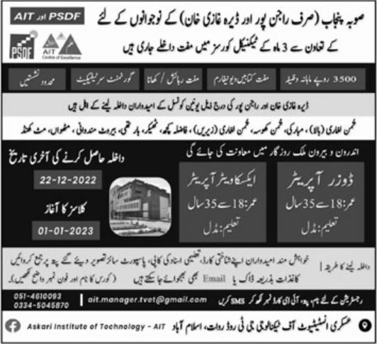 Askari Institute of Technology Dozer Operator, Excavator Operator admissions 2022 has been started. Askari Institute of Technology Rajanpur Dera Ghazi Khan Punjab Pakistan welcomes students to apply for admissions in academic year 2022 in Teaching College. Eligible students for fulfilling criteria for admissions in Course can enroll as per Private admission policy 2022 till closing date 22 December 2022. Read newspaper ad for exact details.