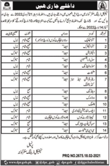Technical Training Centre Auto mechanic, Auto Electric, Electrician, Civil Draftsman, Motor Winding, Machinist, Refrigeration and Air Conditioning, Welding, Woodwork, Plumbing, Diploma in Information Technology, Computer Short Course, Mobile Phone Repairing, CNG Machinist admissions 2022 has been started. Students who want to take admissions in Technical Training Centre Quetta Balochistan Pakistan for academic year 2022 to continue education in Technical Diploma can apply. Students who want to enroll for academic session 2022 in Diploma and Course qualification and admission criteria for Government institute can apply till last date 5 March 2022. Read newspaper ad for exact details.
