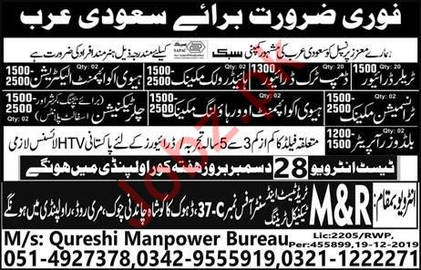 Vacancies in Qureshi Manpower Bureau Advertisement December 2019