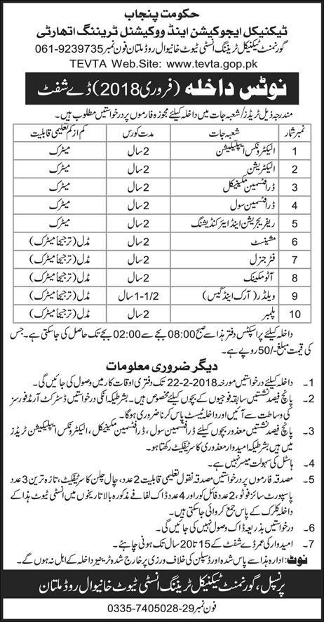 Technical Education and Vocational Training Authority Admission in Diploma in Courses in Electronics, Electrician, Drafts Mechanics, Refrigeration and Auto Mechanics in Multan. Read newspaper ad for exact details.