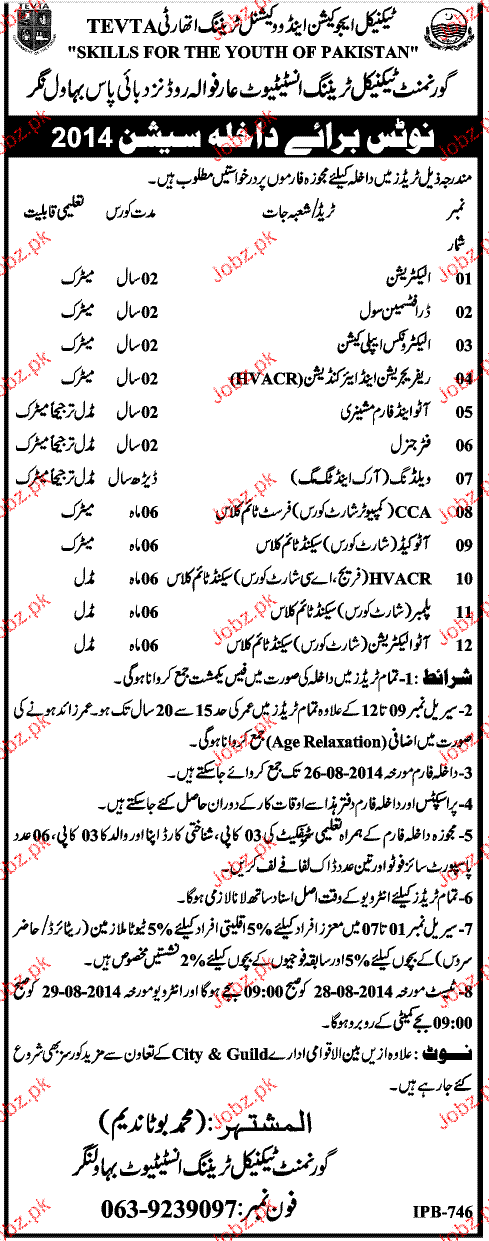 Technical Educational and Vocational Authority Admission in Courses in Bahawalnagar. Read newspaper ad for exact details.