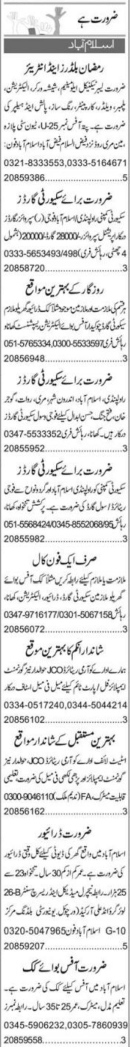 Private Company Islamabad, islamabad Islamabad Pakistan invites applications from eligible candidates for the post of office boy, plumber, retired fauji guard, helper, electrician, welder, superisor guard, technical labor, receptionist, house servant, driver, carpenter, hawaldar, operational supervisor, glass worker, chowkidar, retired jco, cook, painter, security guard, polish man, labor and aluminum worker as per advertisement of June 7, 2022 published in daily Express Newspaper. Intermediate, Middle, Master, Matric and Bachelor etc. educational qualification will be preferred.