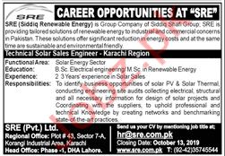 Vacancies in Sadiq Renewable Energy SRE Pvt Ltd Advertisement September 2019