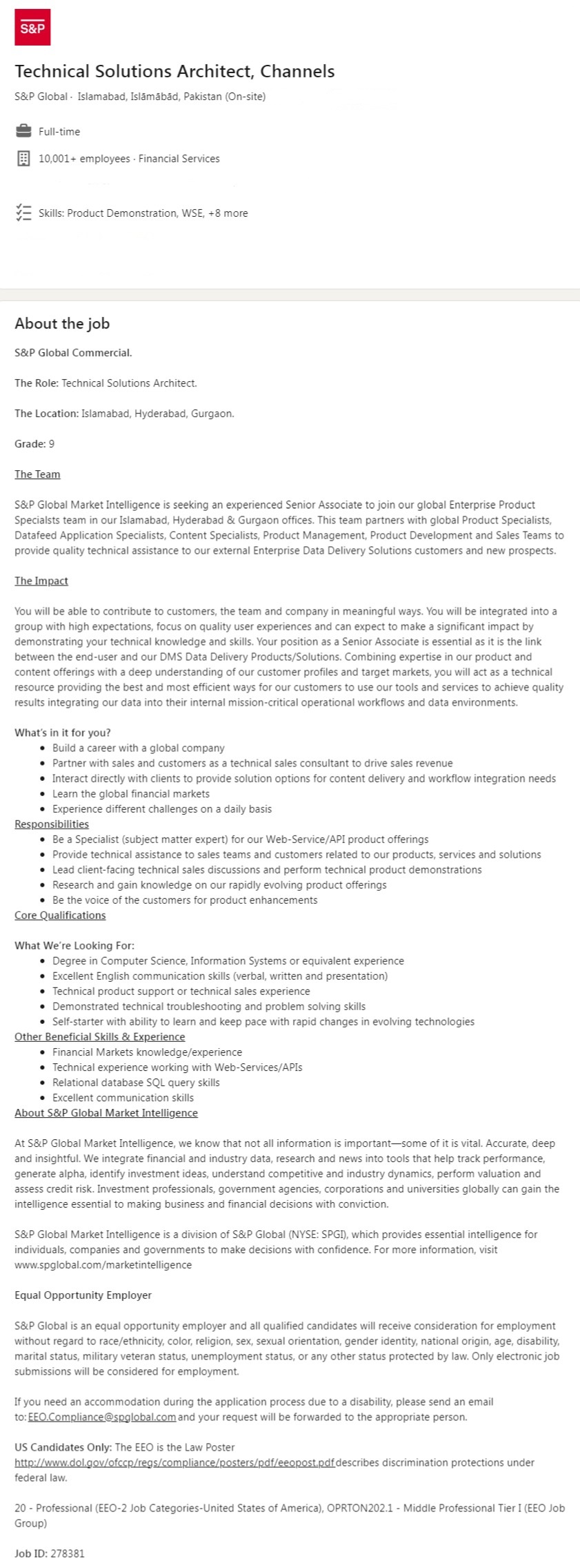 S&P Global Pakistan jobs advertisement dated about 22 March 2023 in daily Other Newspaper invites application for the vacant post of technical solutions architect in Islamabad, islamabad Islamabad Pakistan. Preferred Education is Master and Bachelor etc.