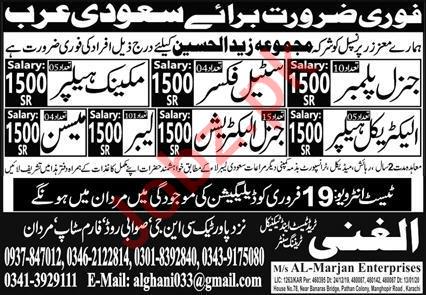 A Leading and Renowned Overseas Company located in Saudi Arabia is currently searching for the experienced, hardworking and energetic candidates for the positions of General Plumber, Steel Fixer, Mechanic Helper, Electrical Helper, General Electrician, Labor, Mason.