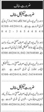Vacant posts including fitter, cnc lathe machine operator, mechanical engineer, sub engineer mechanical, welder, latheman and cnc router operator are announced in Technical Organization Lahore, lahore Punjab Pakistan as per 12 December 2023 advertisement in daily Roznama 92 News Newspaper. Preferred Education is DAE, Intermediate, Matric and Bachelor etc.