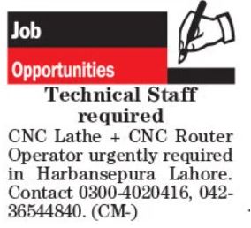 Vacant posts including cnc lathe machine operator and cnc router operator are announced in Technical Organization Lahore, lahore Punjab Pakistan as per 12 December 2023 advertisement in daily The News Newspaper. Preferred Education is Intermediate, DAE and Matric etc.