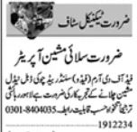 Private Company Lahore, lahore Punjab Pakistan invites applications from eligible candidates for the post of stitching machine operator and technical staff as per advertisement of December 19, 2023 published in daily Dunya Newspaper. Persons with Middle, Intermediate and Matric etc. education can apply.