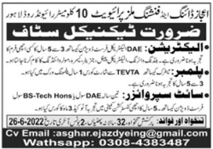 Ejaz Dyeing and Finishing Mill Limited jobs advertisement dated about 19 June 2022 in daily Jang Newspaper invites application for the vacant post of electrician, site supervisor and plumber in Lahore, lahore Punjab Pakistan. Educational qualifications required Others, B.E, DAE and Matric etc.