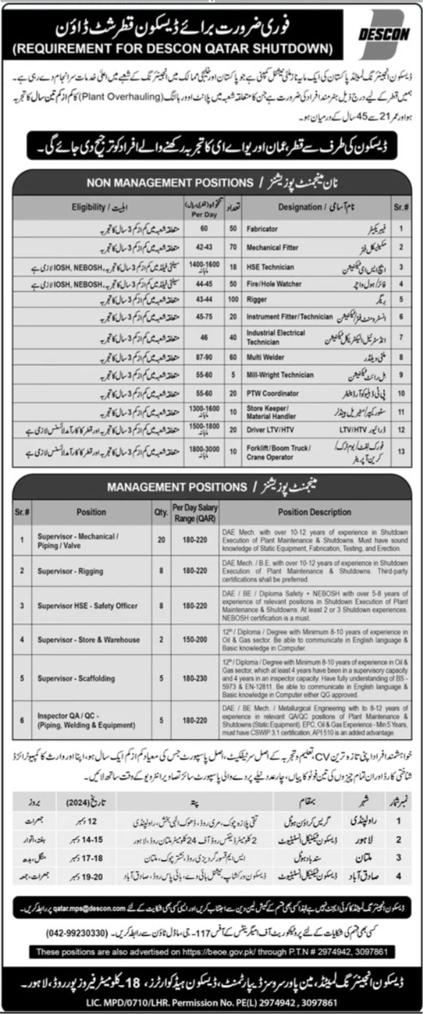 Descon Engineering Limited Qatar, qatar Qatar invites applications from eligible candidates for the post of Trailer Driver, Multi Welder, Driver, Area Planner, Scaffolder, Qc Inspector, Lead Hse, Qc Lead, Area Engineer, Foreman Rigging, Mechanical Fitter, Supervisor Electrical, Electrical Technician, Rigger, Supervisor Hse, Crane Operator, Fabricator, Instrument Technician, Lead Planning, Fire Watcher, Lead Mechanical, Assistant Fitter, Lead Rigging, Electrician, Qa Lead, Supervisor Piping, Incharge Mechanical, Coordinator Ep, Supervisor Mechanical, Fork Lift Operator and Hole Watcher as per advertisement of December 8, 2024 published in daily Jang Newspaper. Preferred Education is Bachelor, DAE and Intermediate etc.