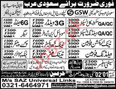 A well reputed and well established company is looking for Quality Assurance Mechanical Inspector, Quality Control Mechanical Control, Welder, Quality Assurance Welding Inspector, Quality Control Welding Inspector, Crane Operator, Rigor, Tank Erection Foreman, Tank Fabricator, Spray Painter, Welding Foreman, Tank Fitter, Tank Supervisor in Saudi Arabia.