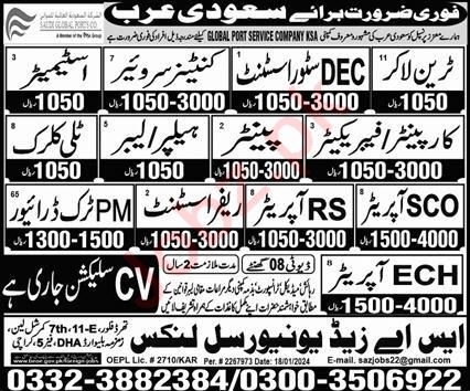MS SAZ Universal Links jobs advertisement dated about 28 January 2024 in daily Express Newspaper invites application for the vacant post of painter, ech operator, sco operator, labor, trane locker, estimator, container surveyor, carpenter, dec store assistant, pm truck driver, fabricator, helper, telly clerk, rs operator and reffer assistant in Saudi Arabia, saudi arabia Saudi Arabia. Intermediate, Matric, DAE and Bachelor etc. educational qualification will be preferred.
