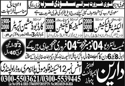 Darain Overseas Employment Promoters jobs advertisement dated about 3 November 2024 in daily Express Newspaper invites application for the vacant post of electrical technician, mechanical technician and car board machine operator in Saudi Arabia, saudi arabia Saudi Arabia. Matric, DAE, Bachelor and Intermediate etc. educational qualification will be preferred.