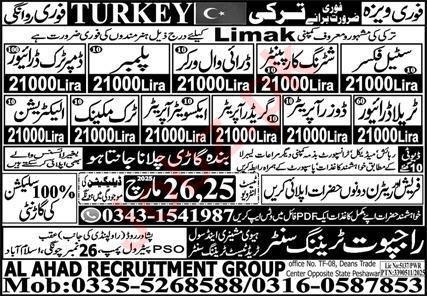 Vacant posts including plumber, electrician, damper truck driver, dozer ioperator, grader operator, dry wall worker, excavator operator, steel fixer, shuttering carpenter, truck mechanic and tralla driver are announced in Al Ahad Recruitment Group Ankara, ankara Turkey as per 24 March 2025 advertisement in daily Express Newspaper. Persons with Middle, Intermediate, DAE and Matric etc. education can apply.