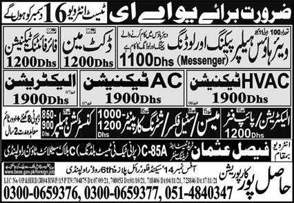 A well reputed and established UAE based company invites applications from highly educated expert and experienced professionals for the post of Warehouse Helper, Packing Helper, Loading Helper, Duct Man, Fire Fighting Technician, HVAC Technician, AC Technician, Electrician, Pipe Fitter, Mason, Steel Fixer Shuttering Carpenter, Construction Helper in UAE.