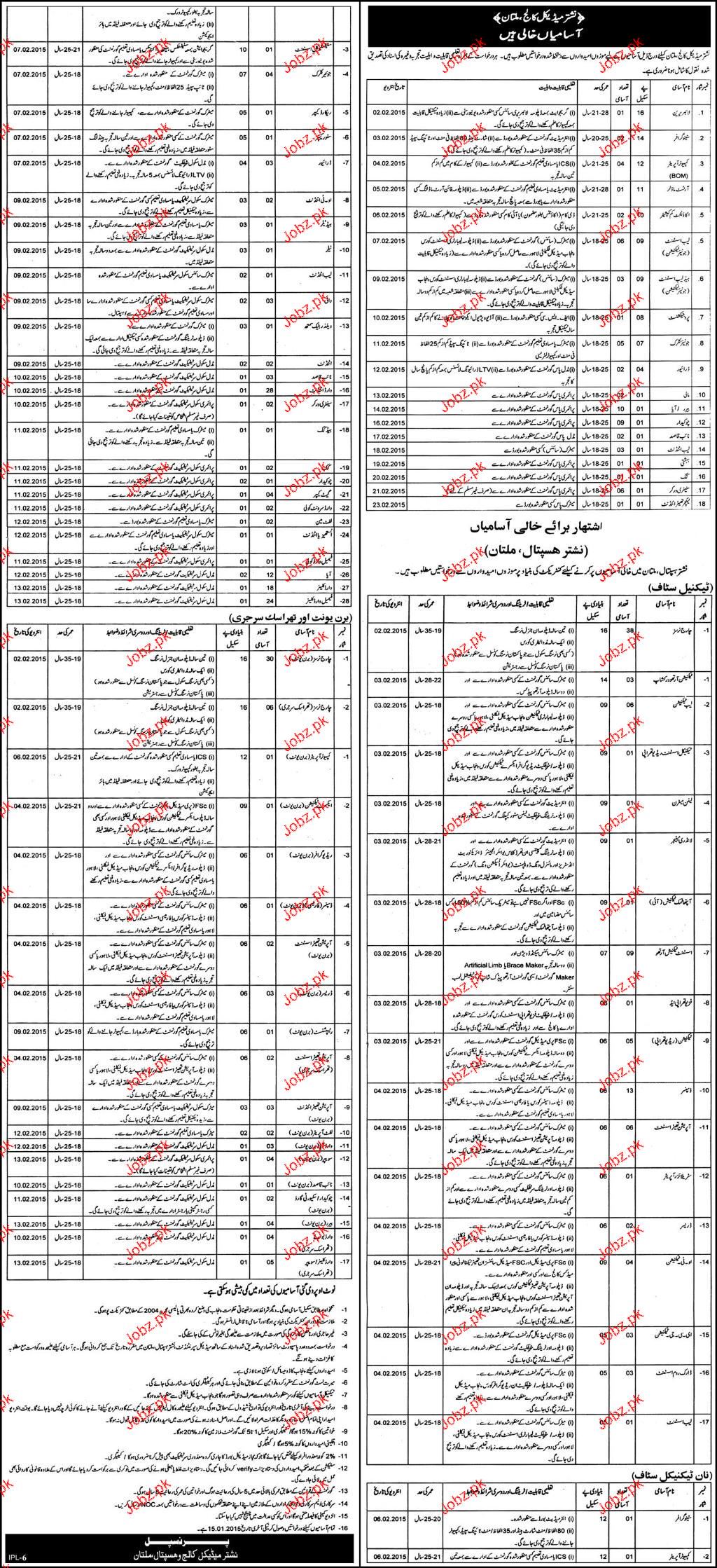 Technicians, Dispensers, Operation Theater Assistant, Assistant Technicians Artho, OT Technicians, ECG Technicians, Receptionist, Lift Technicians, Lab Assistants, Stenographers and Computer Operators are required in Nishtar Medical College and Hospital in Multan.