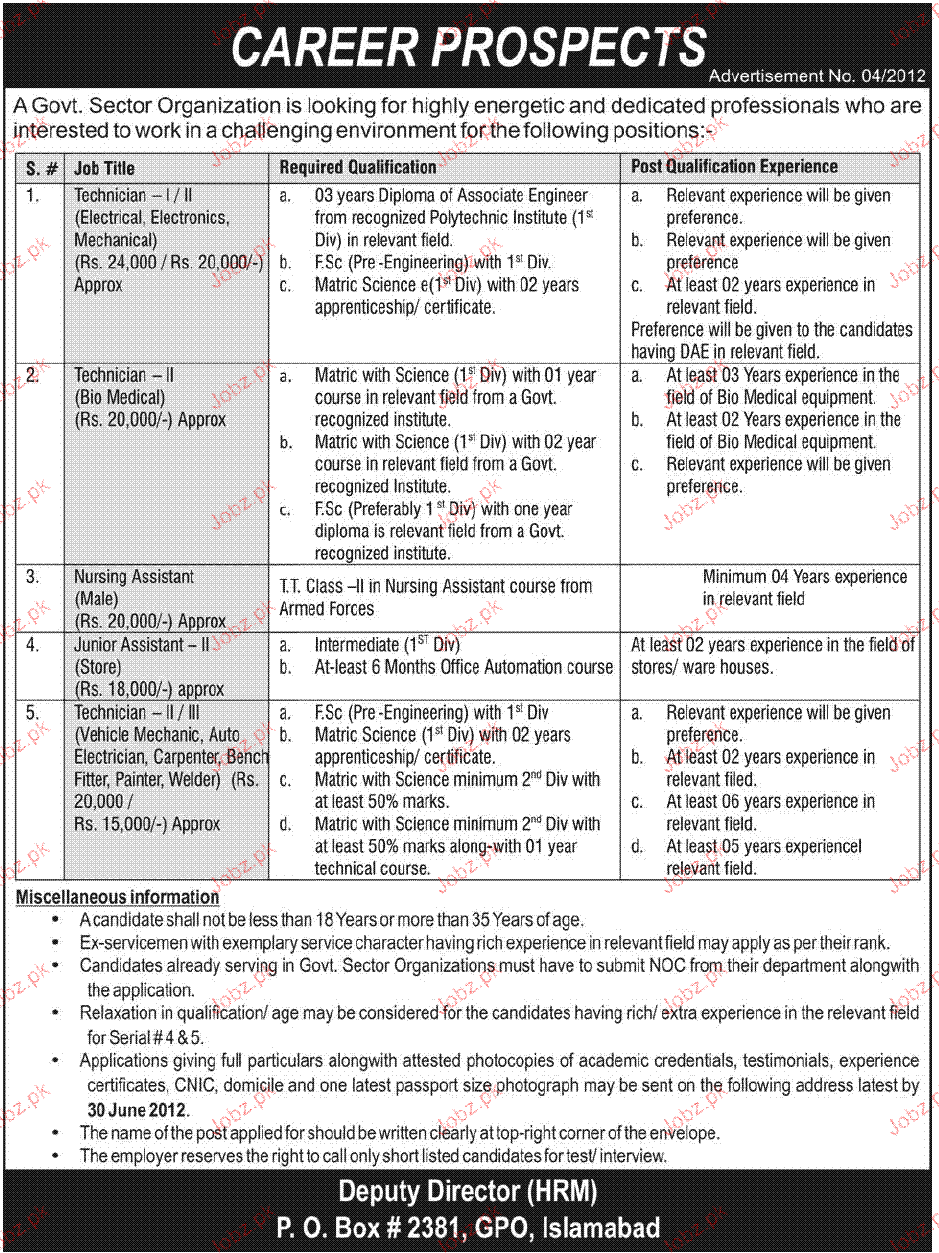 Apply as per details in job advertisement. Login to view further details of how to apply via https://www.jobz.pk online.