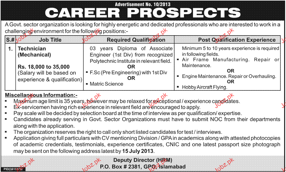 Apply as per details in job advertisement. Login to view further details of how to apply via https://www.jobz.pk online.