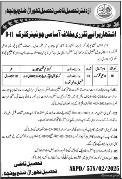 Tehsil Qazi Thorar Jobs 2025 for Junior Clerk