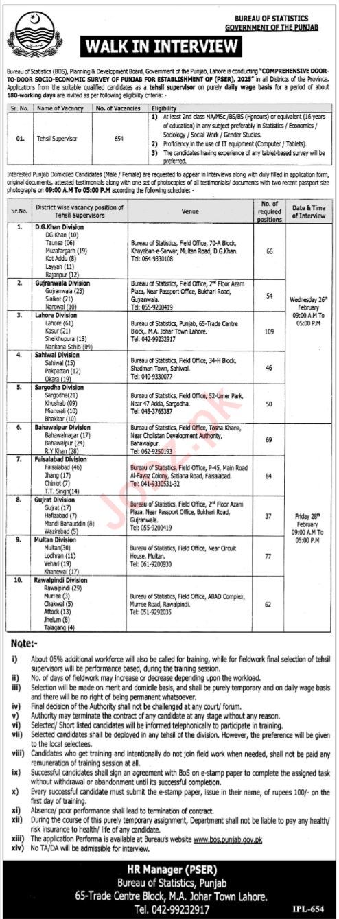 Bureau of Statistics Johar Town Lahore, lahore Punjab Pakistan invites applications from eligible candidates for the post of tehsil supervisor as per advertisement of February 16, 2025 published in daily Express Tribune Newspaper. Persons with M.sc and MA etc. education can apply.
