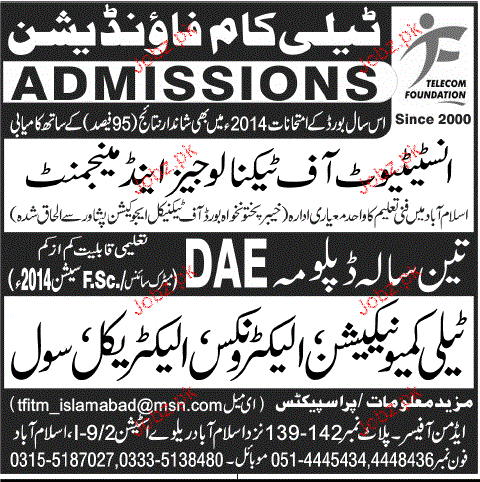 Telecom Foundation Admission in DAE in Islamabad. Read newspaper ad for exact details.