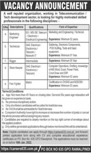 Vacancies in Telecommunication Company Advertisement January 2022
