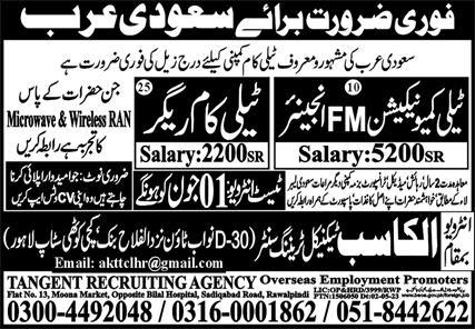 Tangent Recruiting Agency Saudi Arabia, saudi arabia Saudi Arabia invites applications from eligible candidates for the post of telecom rigger and telecommunication fm engineer as per advertisement of May 30, 2023 published in daily Express Newspaper. Preferred Education is Master, DAE and Bachelor etc.