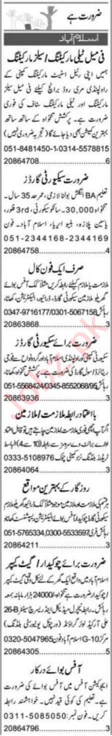 Private Company jobs advertisement dated about 27 July 2022 in daily Express Newspaper invites application for the vacant post of civil security guard, telemarketing officer, chowkidar, office boy, receptionist, security guard, electrician, security staff, house worker, cook, ltv driver, gate keeper, telemarketing staff and driver in Islamabad, rawalpindi Islamabad Pakistan. Candidates with Middle, Matric, Bachelor and Intermediate etc. educational background will be preferred.