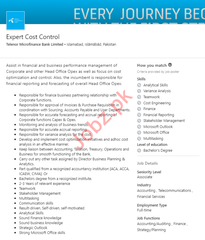 Telenor Microfinance Bank Jobs 2020 Expert Cost Control