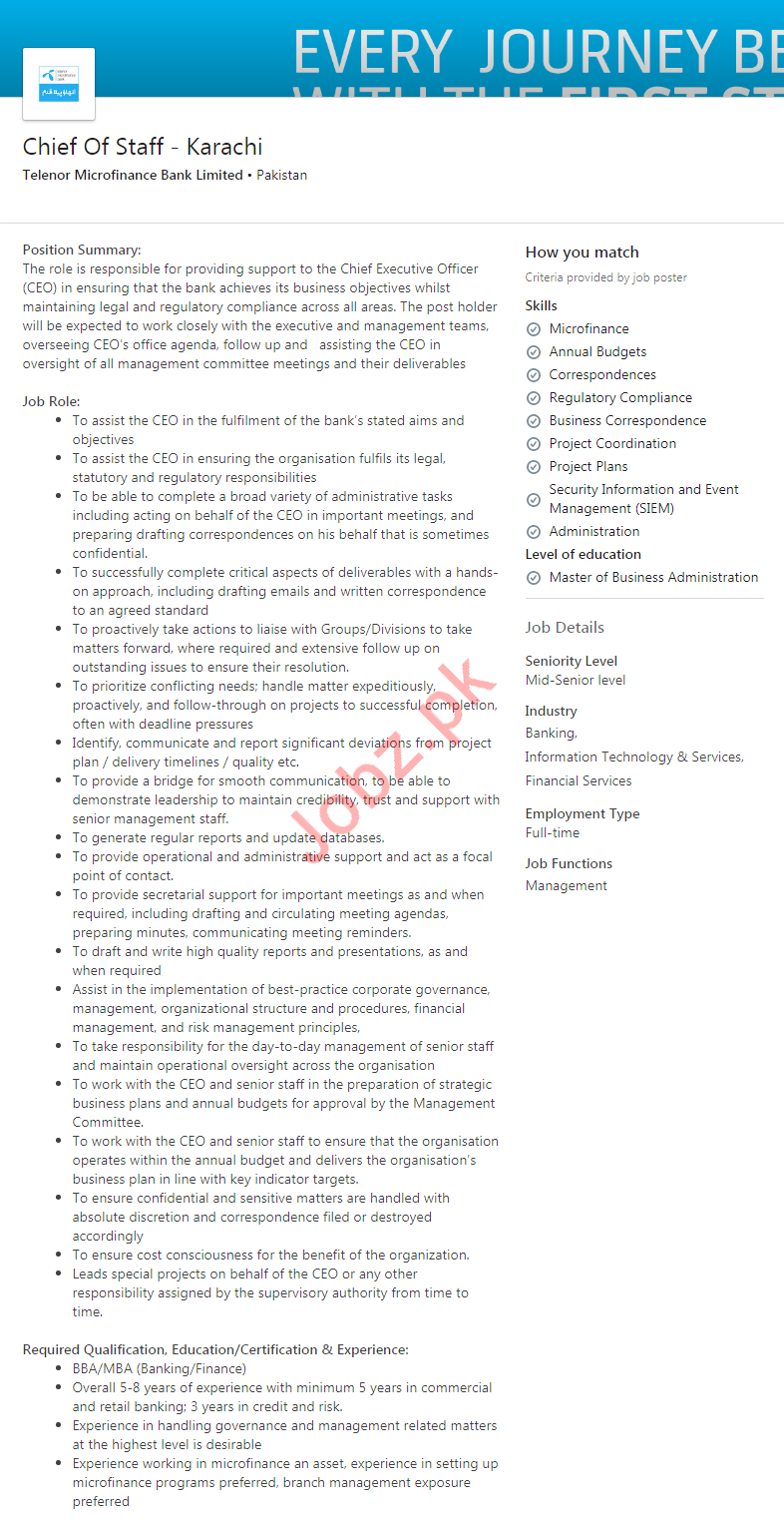 Telenor Microfinance Bank Limited Job For Chief Of Staff