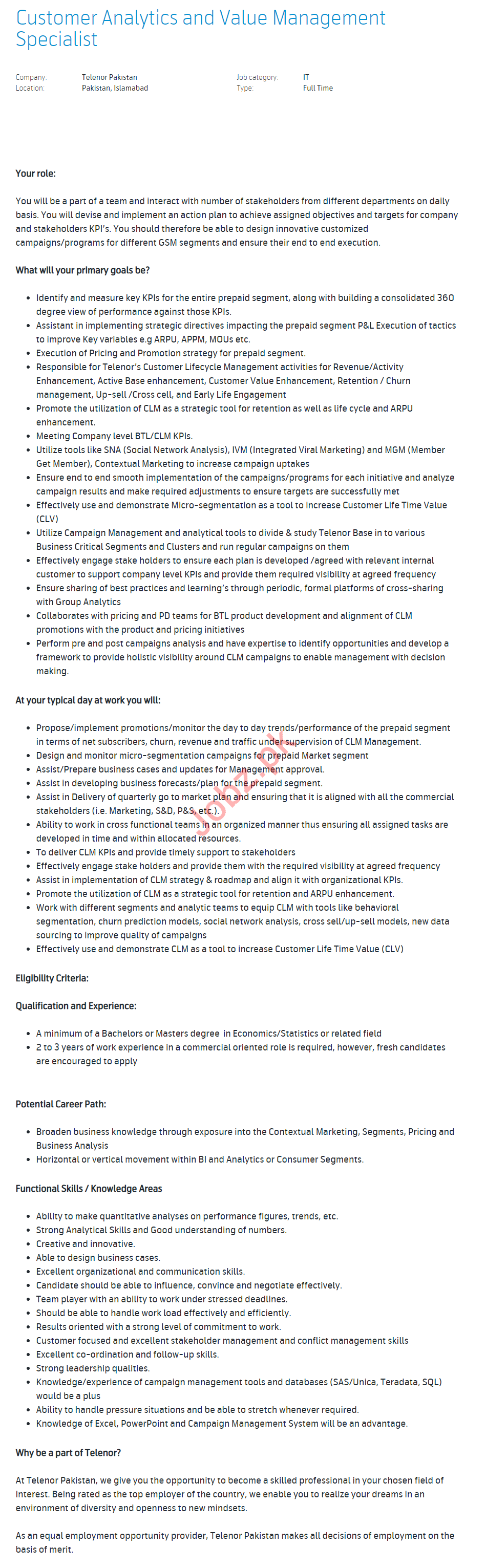 Vacancies in Telenor Pakistan Advertisement March 2020