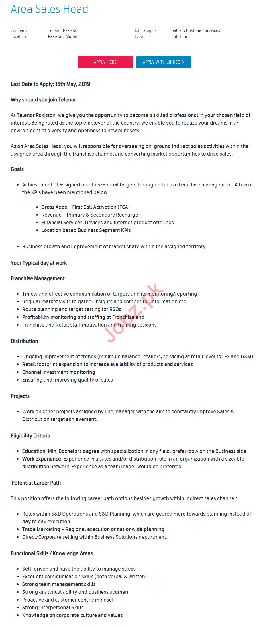 Vacancies in Telenor Pakistan Advertisement May 2019