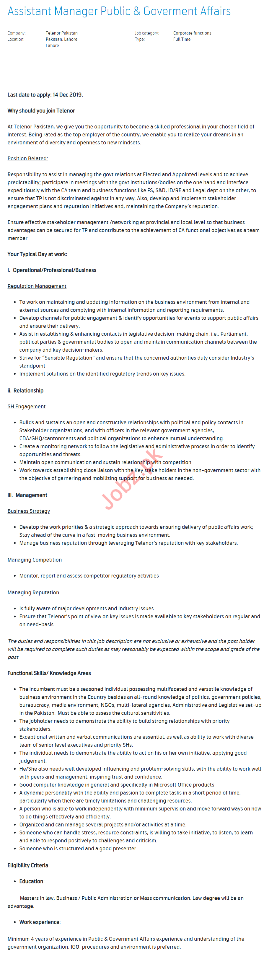 A Reputed and Renowned Private Telenor Pakistan Company located in Lahore, Punjab, Pakistan is currently searching for the experienced, hardworking and self motivated candidates for the positions of Assistant Manager Public, Assistant Manager Government Affairs.