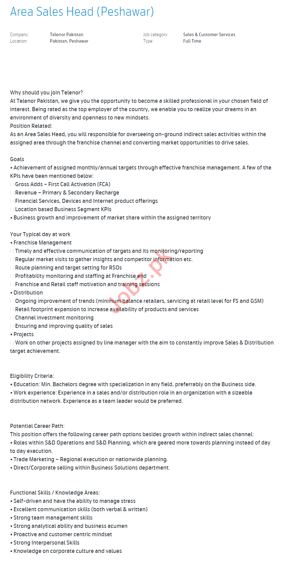 Telenor Pakistan Peshawar Jobs 2019 For Area Sales Head