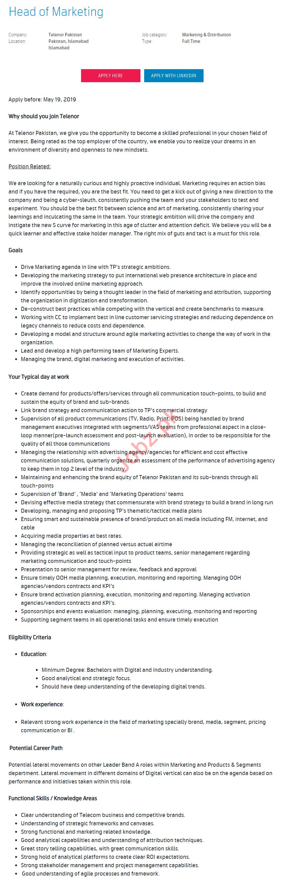 Vacancies in Telenor Pakistan Advertisement May 2019