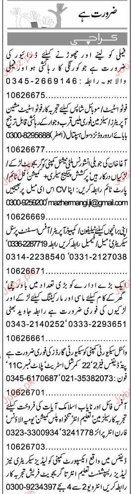 Telephone Operator, Computer Operator, Cook, Secretary and Marketing Staff are required in Karachi