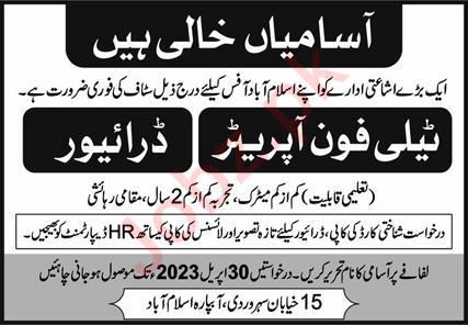 Publishing Company jobs advertisement dated about 16 April 2023 in daily Express Newspaper invites application for the vacant post of telephone operator and driver in Islamabad, islamabad Islamabad Pakistan. Persons with Bachelor, Middle, Matric and Intermediate etc. education can apply.