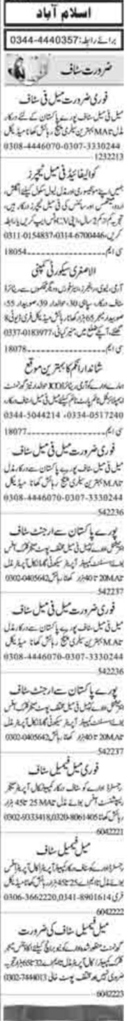 Private Company invites applications for job positions advertised in daily Dunya dated 6 April 2022 for following vacancies in Islamabad, islamabad Islamabad Pakistan.