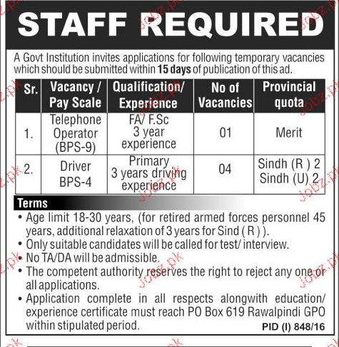 Apply as per details in job advertisement. Login to view further details of how to apply via https://www.jobz.pk online.