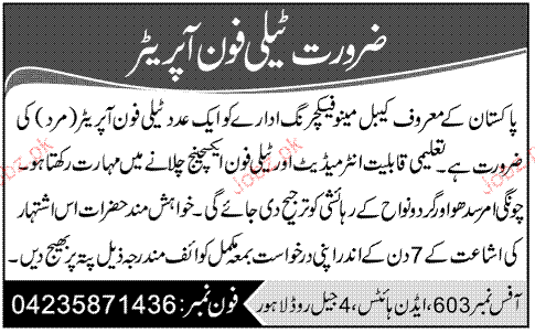 Latest Private Company Telephone Operator Posts Lahore 2025