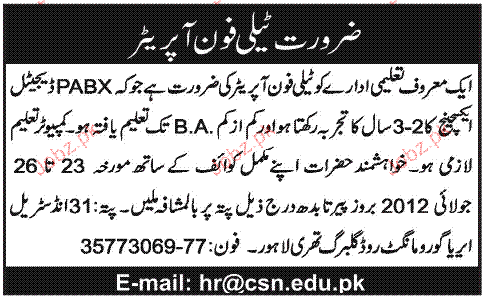 Latest Private Company Telephone Operator Posts Lahore 2025