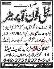 Latest Private Company Telephone Operator Posts Lahore 2025