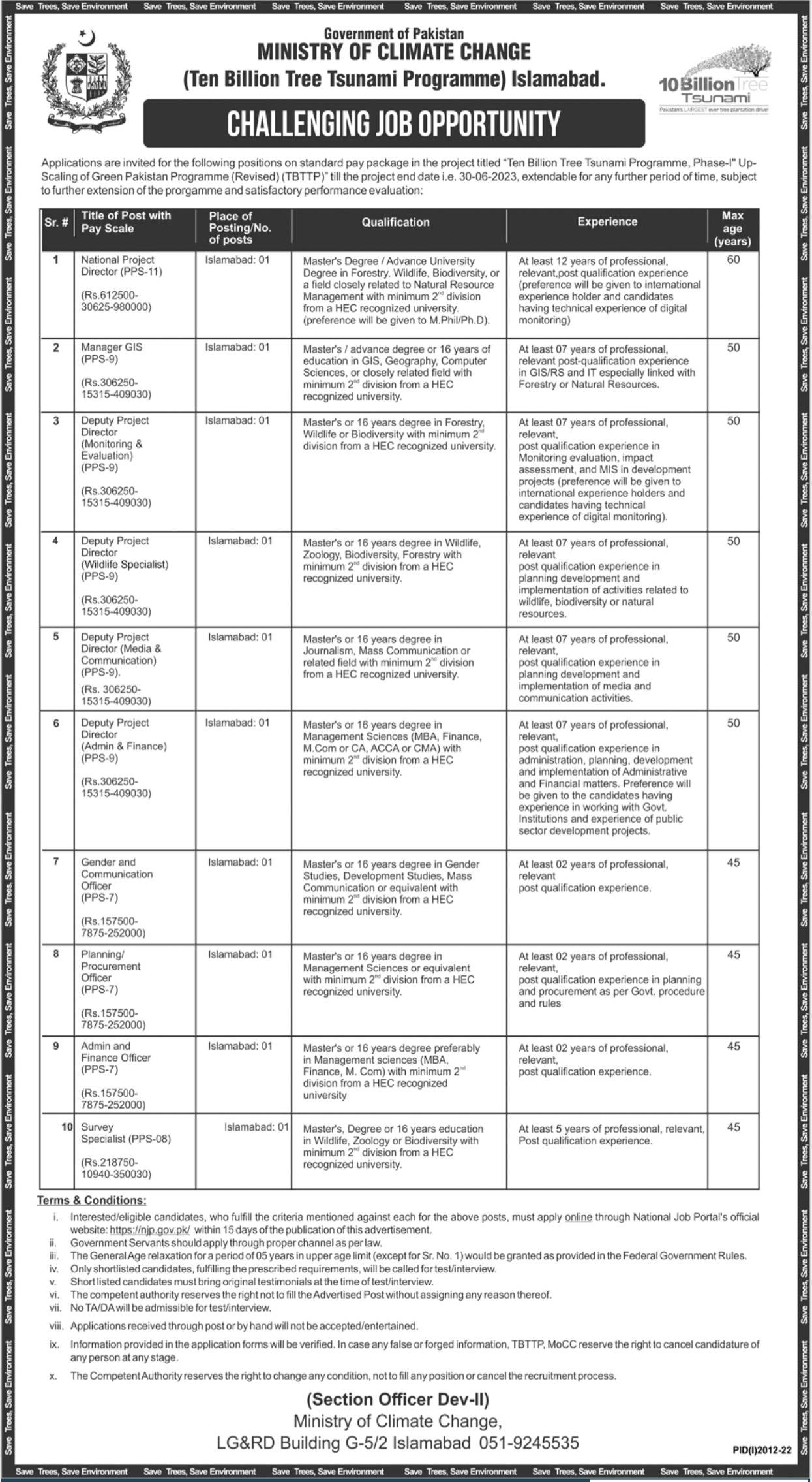 Ministry of Climate Change is looking for candidates for following posts as per job advertisement published in daily Jang Newspaper of September 29, 2022 for location Islamabad, islamabad Islamabad Pakistan: