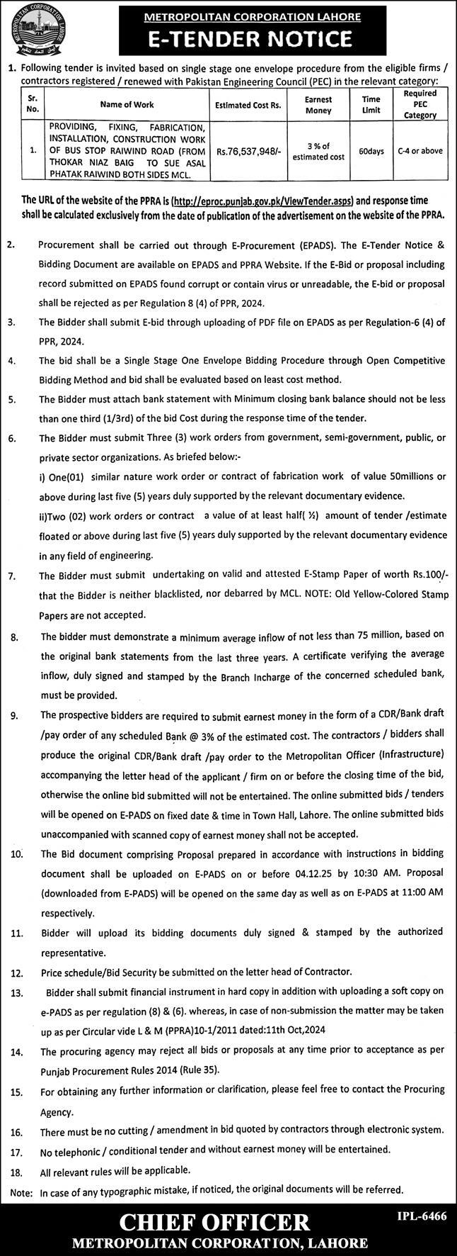 As per Metropolitan Corporation tender advertisement of November 2025 regarding Appliances work and related tasks tenders are invited from qualified contractors in Lahore Punjab Pakistan.