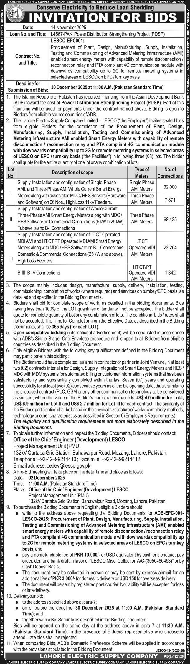 Lahore Electric Supply Company LESCO latest tenders 2025 for Appliances and related tasks are invited as per advertisement in daily Express of November 2025 in Lahore Punjab Pakistan.