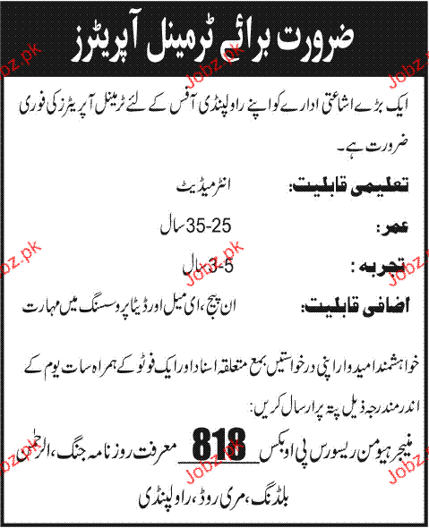 Apply as per details in job advertisement. Login to view further details of how to apply via https://www.jobz.pk online.