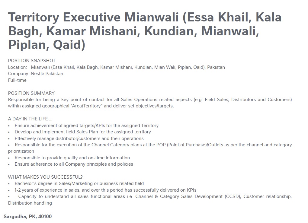 Original Source: https://jobdetails.nestle.com/job/Sargodha-Territory-Executive-Mianwali-%28Essa-Khail%2C-Kala-Bagh%2C-Kamar-Mishani%2C-Kundian%2C-Mianwali%2C-Piplan%2C-Qaid%29-40100/976179801/?feedId=256801&utm_sourc