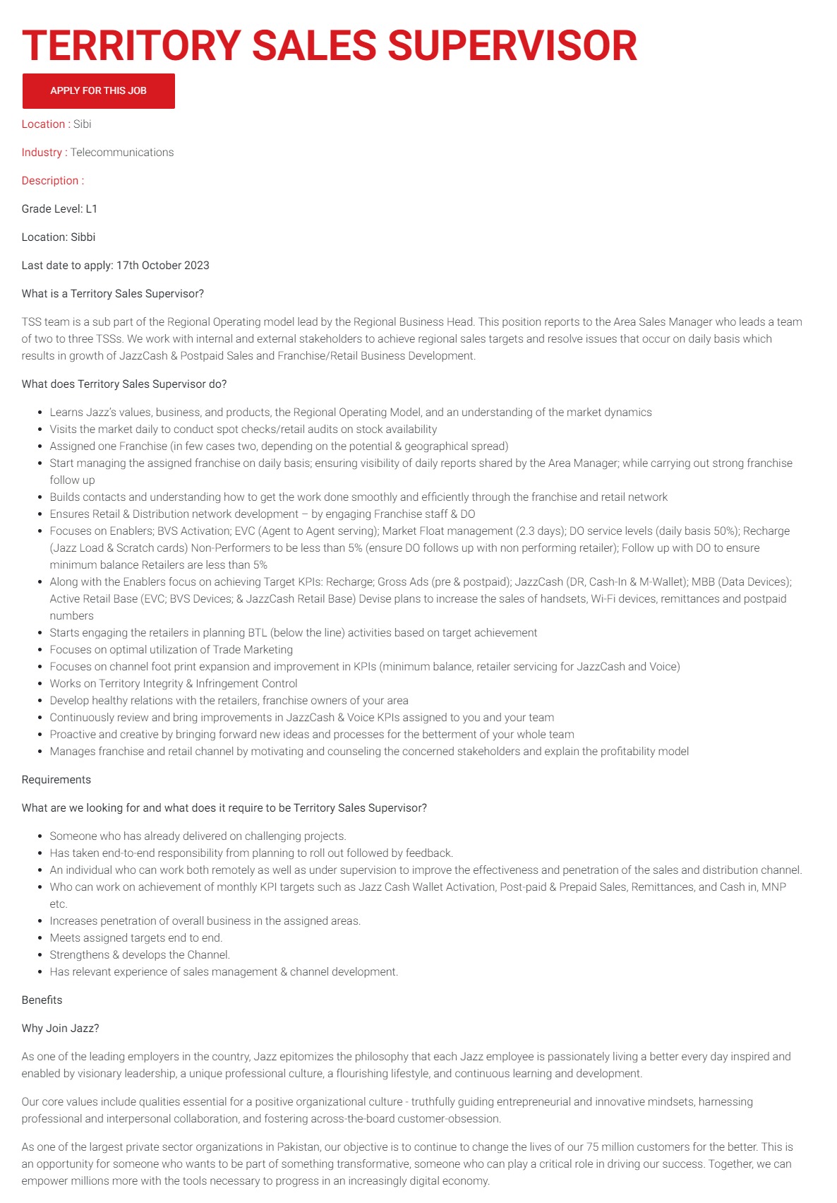 Jazz Telecom jobs advertisement dated about 14 October 2023 in daily Other Newspaper invites application for the vacant post of territory sales supervisor in Sibi, sibi Balochistan Pakistan. Candidates with Bachelor etc. educational background will be preferred.